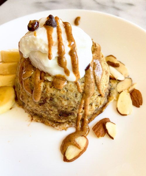 I set out to make a healthier mug muffin that can be enjoyed as a healthy breakfast but that can also be dressed up to satisfy a sweet tooth craving! I also polled on my Instagram for flavor combination requests and chocolate was a clear winner so that inspired me to make this almond-banana-sea salt-chocolate chip oat muffin!
